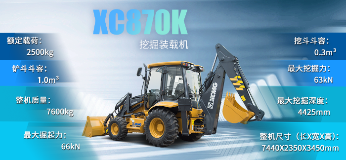徐工XC870K挖掘装载机搭载徐工定制满足TIER Ⅲ排放发动机,徐工专用变速箱,驱动桥,表现出动力强劲 糖心视频高清,传动平稳,可靠等优点,采用世界领先的液压系统分配技术,工作装置结构优化,保障高强度,高效率,高节能的作业需求,另外还配置了高温,高寒,高原,高粉尘等多种环境适应性技术,满足客户不同工况需求。
