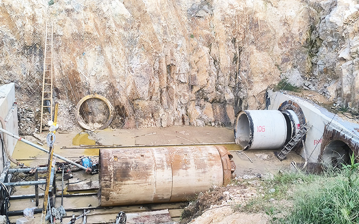 徐工XDN1800-R 岩石顶管机横穿202省道、打进山体,顶进地层全段为硬岩(花岗岩)以及少数的弱风化岩石地层,岩石硬度在120~140MPa 左右,单段顶进 210 米,顶进直径1,8米、长2米的水泥管,最终用时58天,顺利出洞。 糖心视频高清。