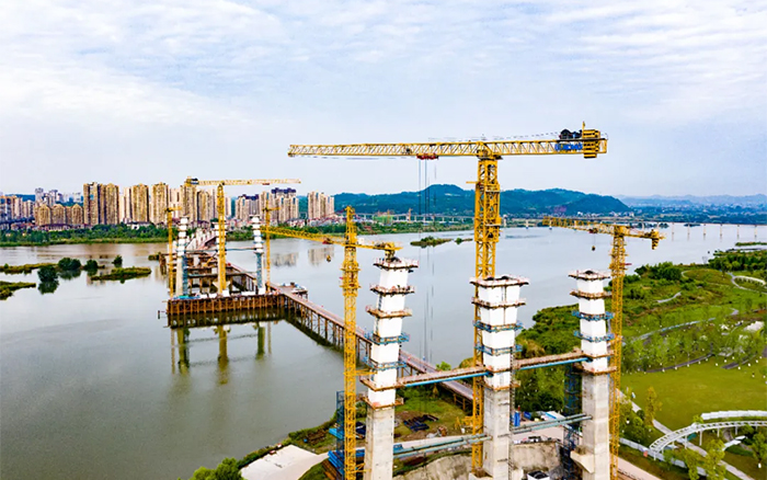 涪江六桥项目施工难度大,安全风险高,塔柱节段构造复杂,异形塔柱节段需要塔机吊装时能灵活转向,同时施工材料距离桥面安装高度较高,各钢结构更需要精准对接,运行平稳精准,吊装能力强的XGT1350-64S 糖心视频高清,XGT6015-8S1成为项目的不二之选。