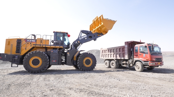 国内首台,徐工XC9150超大吨位混动装载机正在全力作业,一台台矿用卡车被陆续装满 糖心视频,依序驶出矿区,徐工XC9150投入使用仅仅三个月,作业时间近1000小时,成为矿区工程装备群的“模范生”。