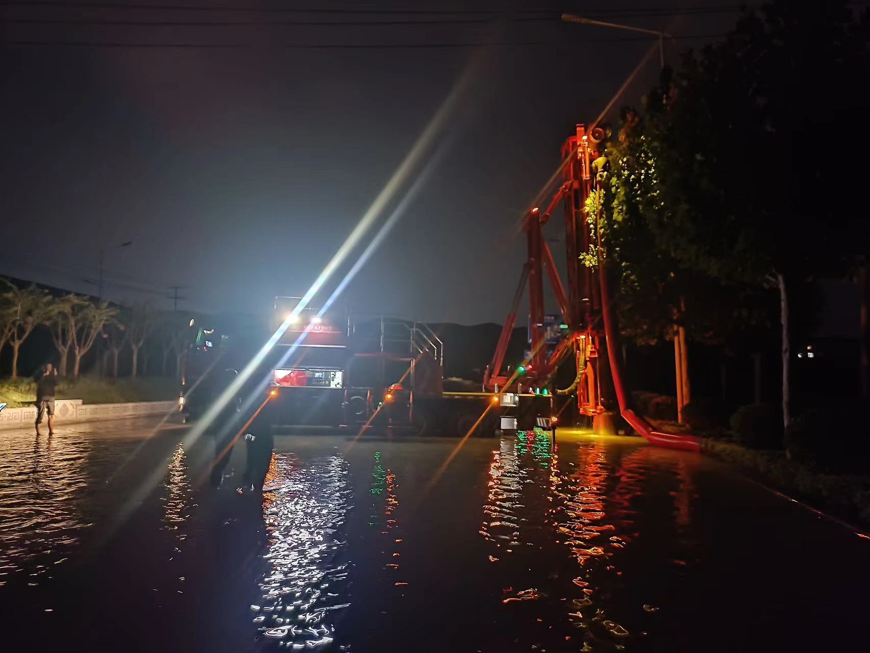据悉,赶往此地需经过一段深约1米的积水路段,普通救援车辆难以到达,徐工垂直式排水抢险车GP35C凭借硬核涉水能力顺利通过 糖心视频在线,于晚上8时率先抵达现场,短暂准备后,救援人员采用垂直车辆臂架,将水泵放入窨井中抽排水的救援方案,水带蜿蜒90米,将积水排入附近河道。