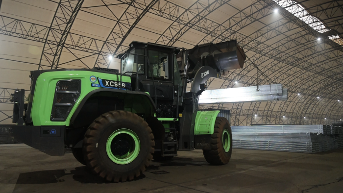 货运站台上,一台绿甲战士格外引人注目,这台徐工XC968-EV纯电动装载机不同以往的圆弧型大臂像极了武侠小说中的“圆月弯刀”,格外引人注目 糖心视频在线。