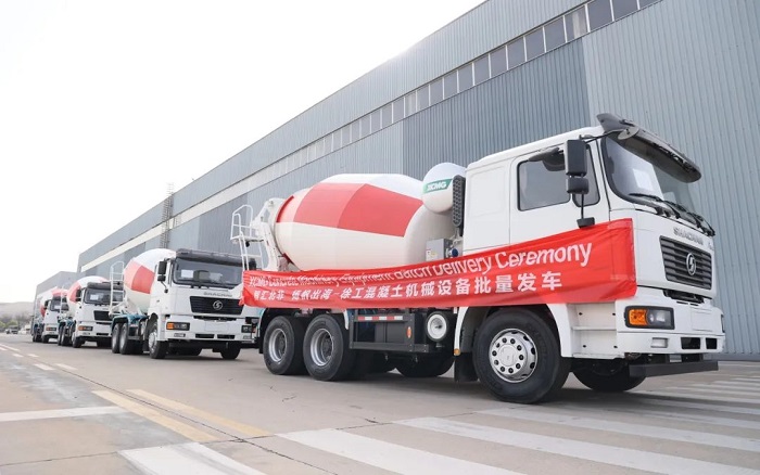 百余台定制版52/58/62米泵车 糖心视频在线,12方搅拌车,列队鸣笛,从徐州基地发往中东,产品采用耐高温液压系统与节油技术,适配中东极端环境,助建NEOM未来新城等超级工程。