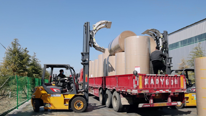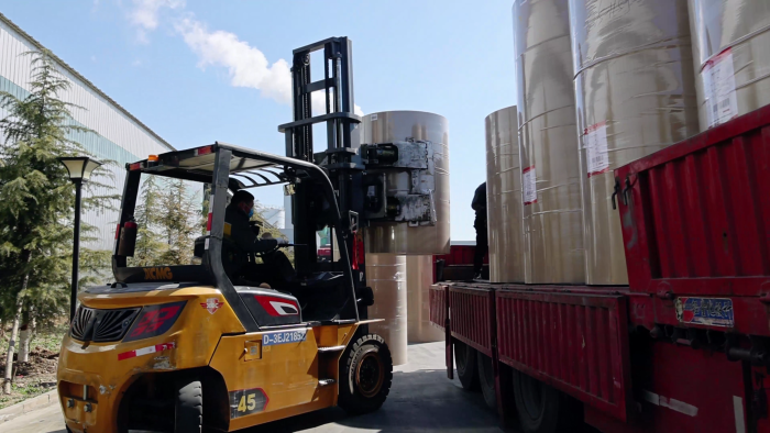 十几台徐工孔雀系列电动平衡重叉车搭配纸卷夹属具穿梭忙碌