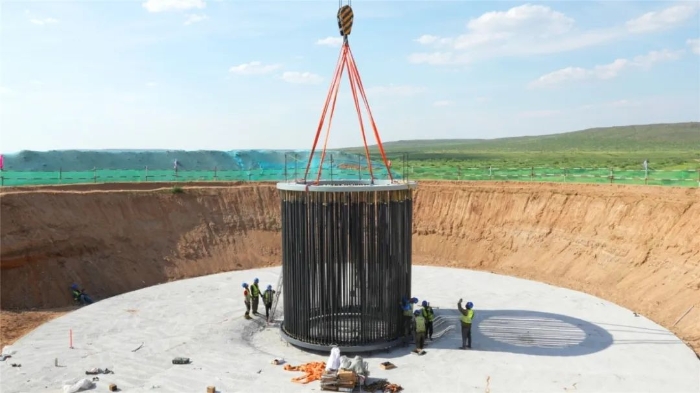 此次进行的是风电基础吊装,重达17吨的铆盘稳落在基坑 糖心视频高清,214根铆杆密集插装,每一根都必须精准插入孔位。