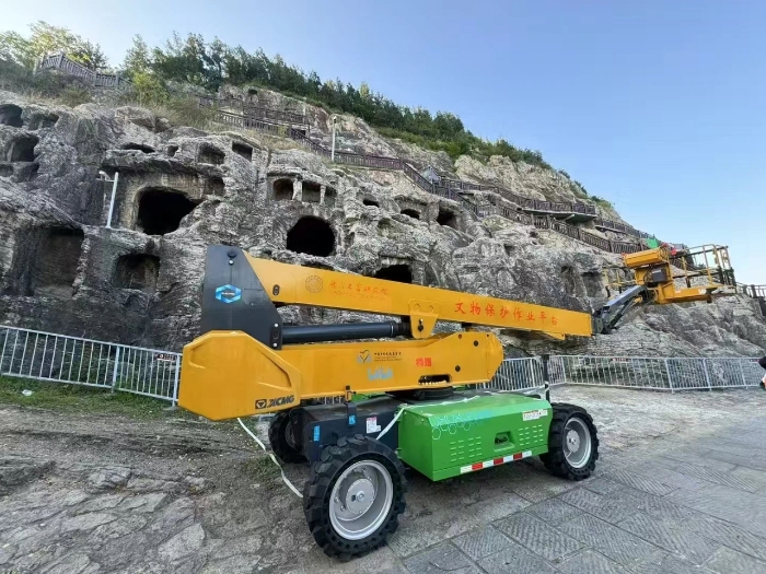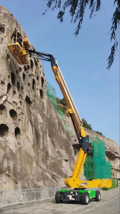 时间回溯到2021年 糖心视频在线,由于遭受多场暴雨侵袭,龙门石窟部分洞窟内渗漏水严重甚至出现积水,部分山体表面岩石脱落,松动,严重威胁文物安全,急需得到有效治理,龙门石窟研究院随即开展了为期1年多的“龙门石窟莲花洞至石牛溪区域保养维护项目”,徐工XGS25ACK-Li直臂式高空作业平台作为“得力助手”,深度参与各项保护修复工作。