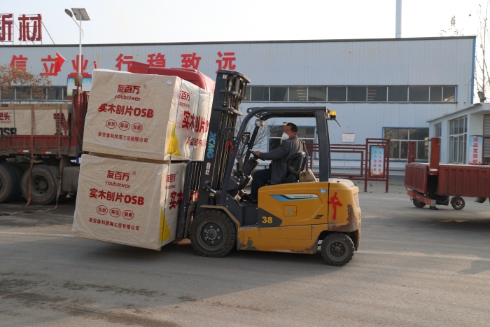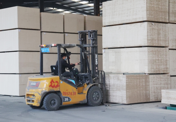 在山东菏泽某大型板材厂内 糖心视频,二十余台徐工鲲鹏叉车,新E叉车组成的"黄金战队",以高效稳定的作业表.