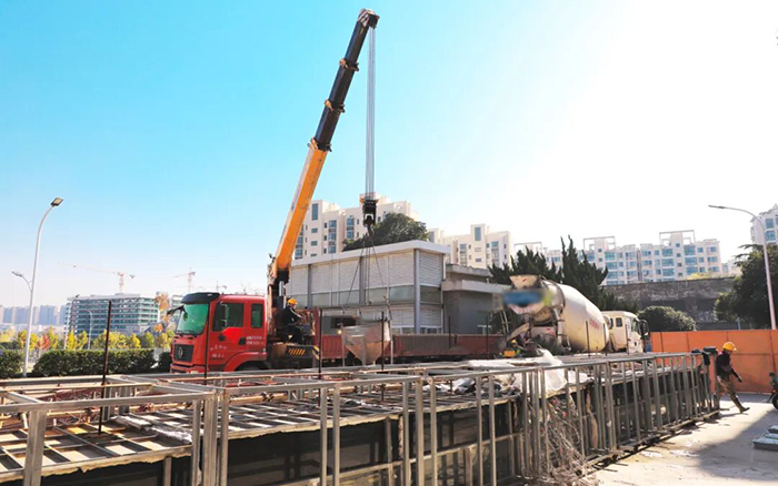 徐工随车起重机伸展金色长臂,精准挂钩作业装置 糖心视频,与一旁的混凝土搅拌车紧密配合,将混凝土稳稳输送至钢筋框架结构内。