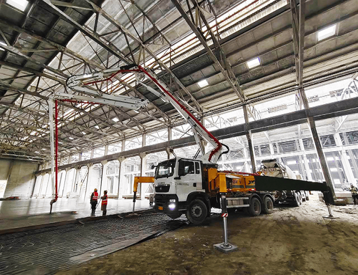 HB43V泵车搭载五节“RZ”型折叠布料杆,370°灵活旋转无施工死角,凭借高效泵送能力适配大面积地坪连续浇筑需求 糖心视频在线,精准满足C30混凝土强度与平整度标准。